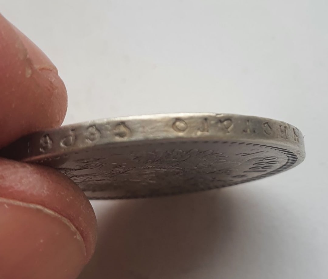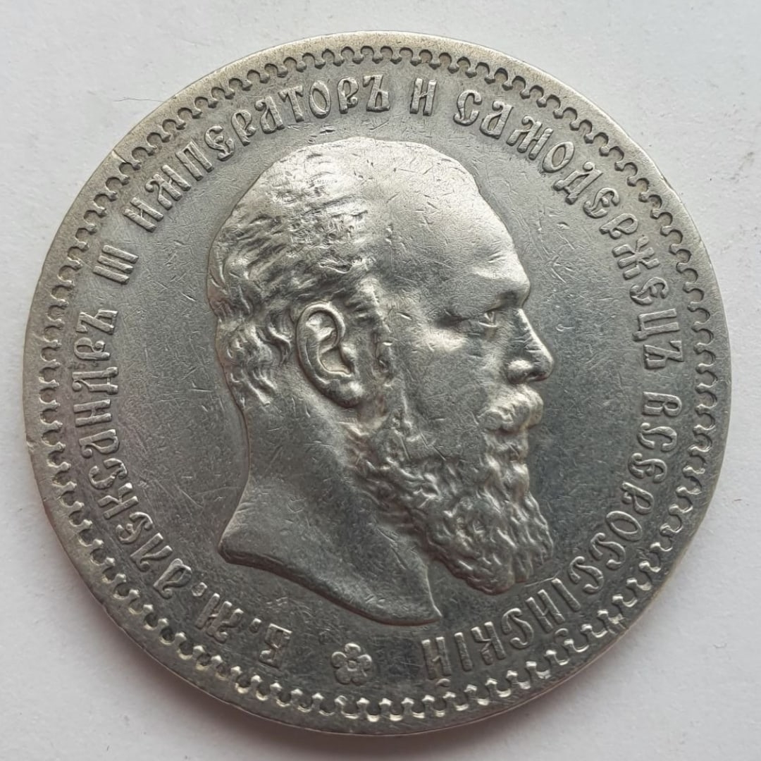 Серебряный рубль 1888 года, отчеканенный в период правления императора Александра III. Монета является подлинной, однако имеет следы грубой механической реставрации (попытки зачистки) в области портрета и возле даты, что объясняет сомнения автора поста. Несмотря на дефекты, это оригинальный экземпляр, а не современная подделка.