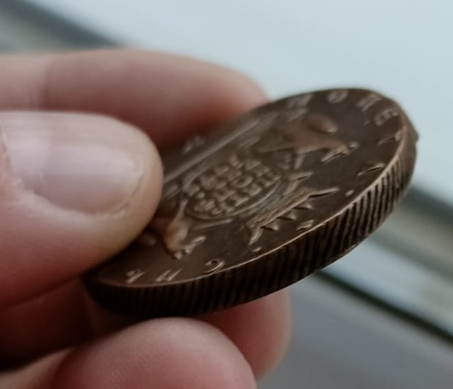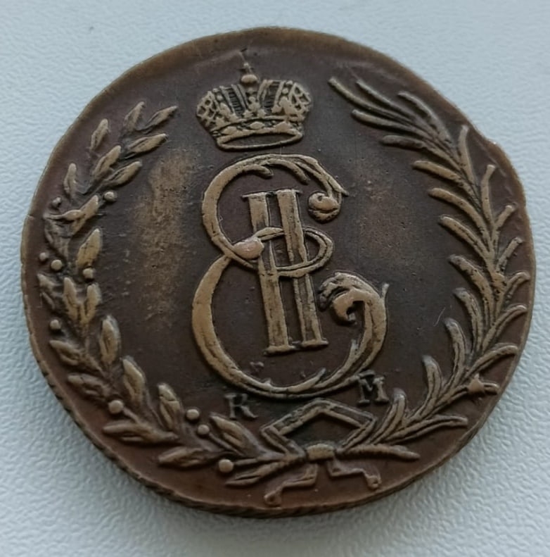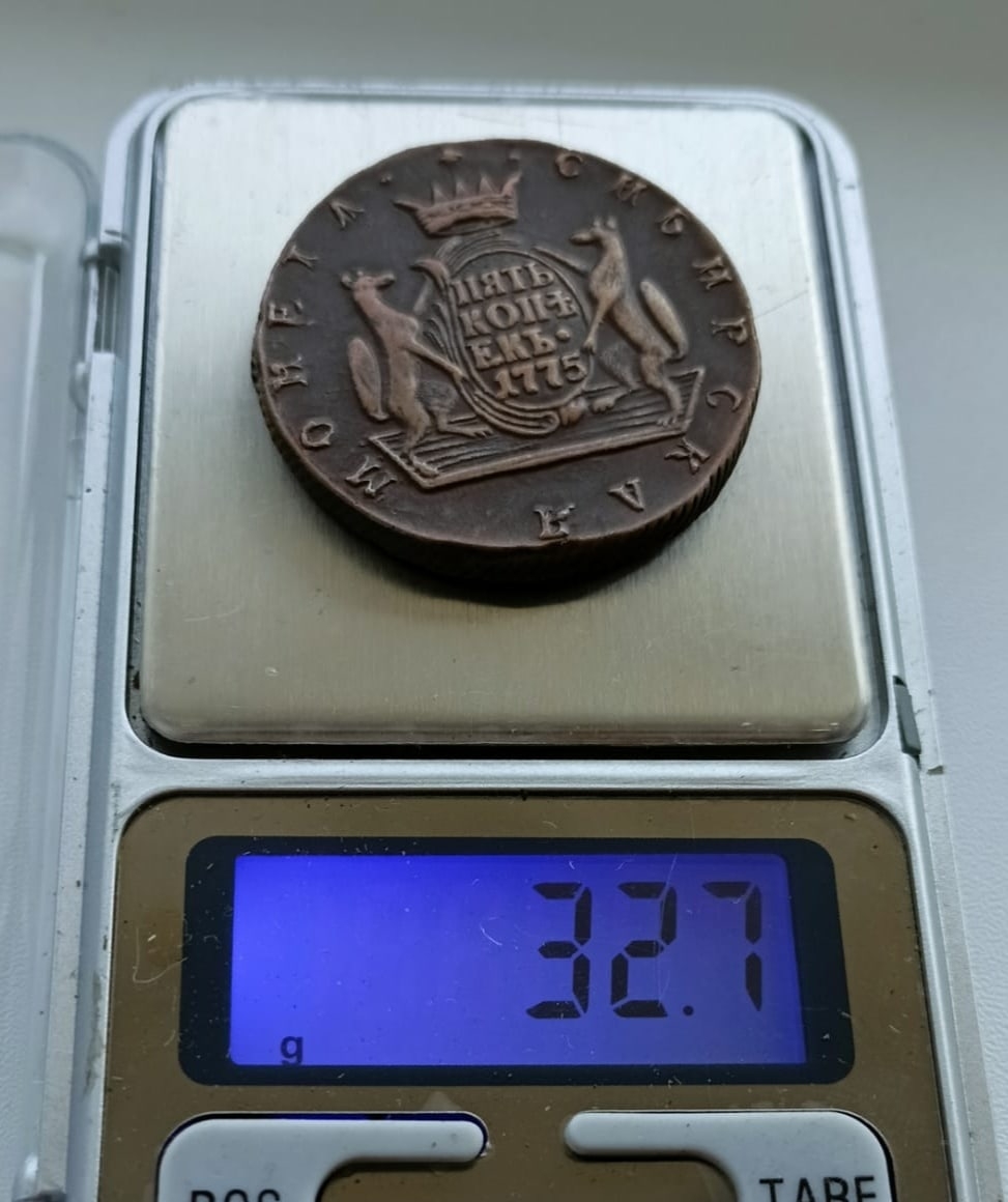 Монета 5 копеек 1775 года периода правления Емператрицы Екатерины II. Представленный экземпляр является современной подделкой (фуфло), что подтверждается сообществом нумизматов. Ключевыми признаками фейка являются неестественно острый и кривой гурт, а также подозрительный, утолщённый шрифт легенды.