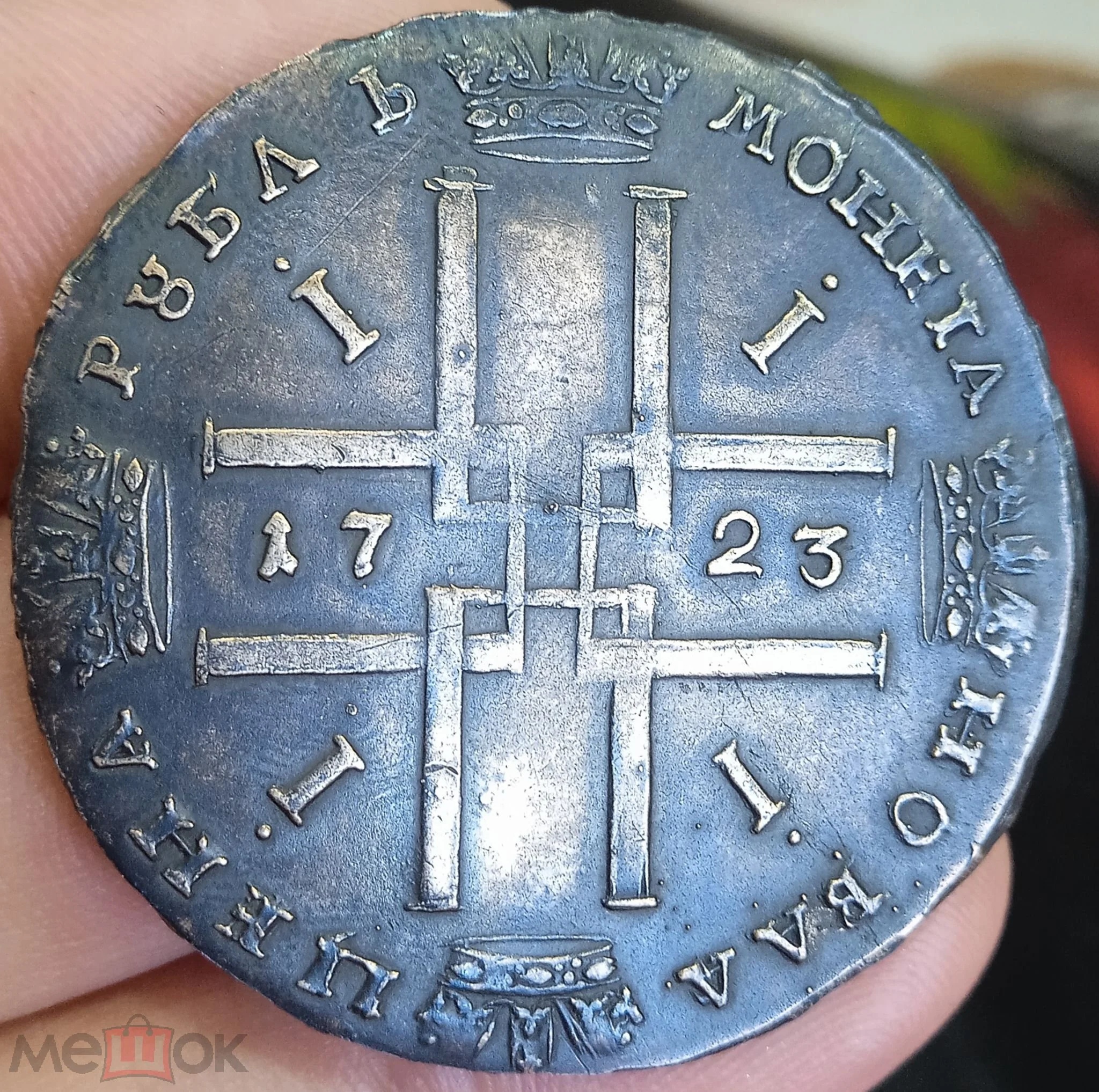 Монета представляет собой копию серебряного рубля 1723 года, отчеканенного в период правления Петра I. Оригинальные монеты этого типа имеют высокую коллекционную ценность и сложны в изготовлении. В посте автор прямо указывает, что это копия, что исключает её подлинность.