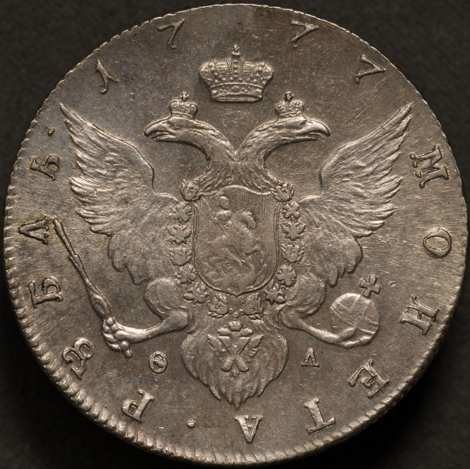 Монета представляет собой подделку серебряного рубля 1777 года периода правления Екатерины II. Оригинальные монеты этого типа чеканились на Санкт-Петербургском монетном дворе (обозначение СПБ). Копия отличается высоким, но неидеальным качеством исполнения, что характерно для современных реплик.