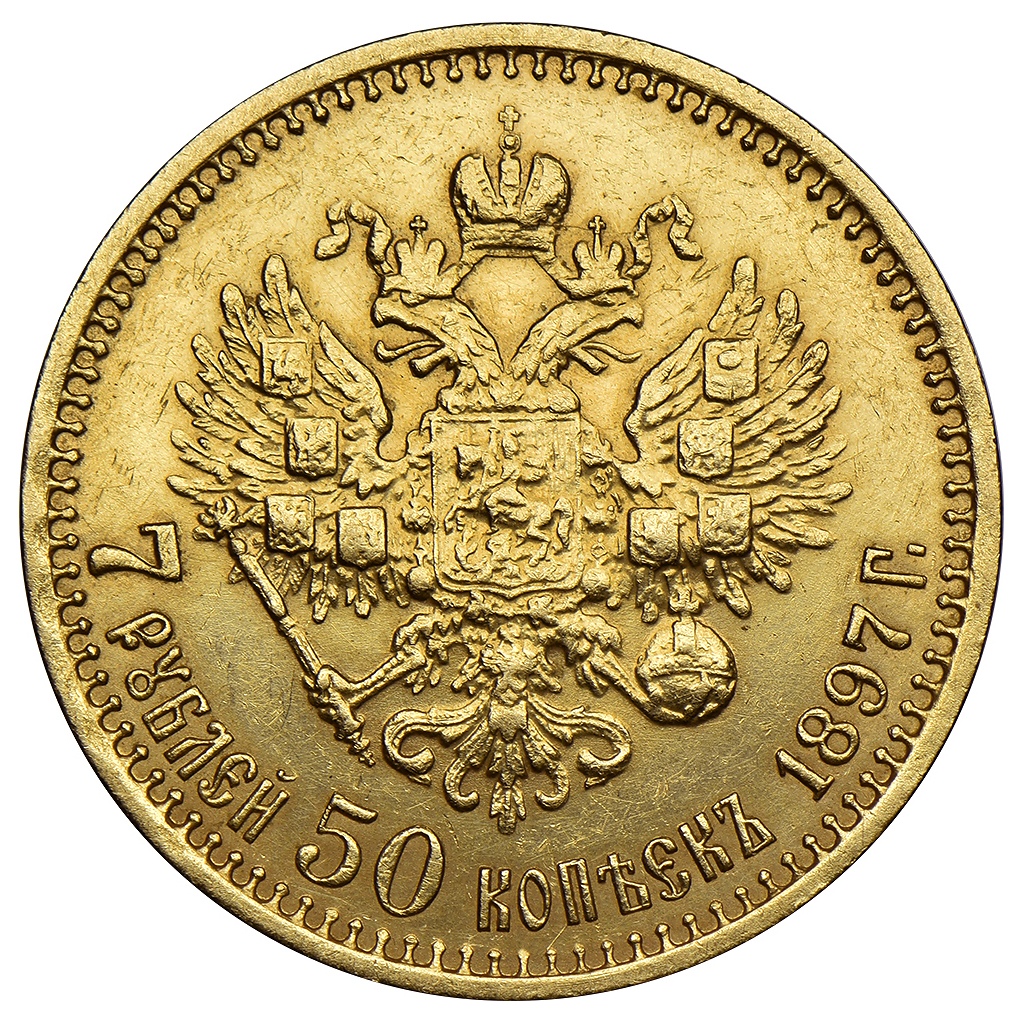 Монета номиналом 7 рублей 50 копеек 1897 года, отчеканенная в период правления Николая II. Данный золотой номинал был выпущен в рамках денежной реформы Витте. Представленный экземпляр является подделкой, о чём прямо указано в описании поста и подтверждается данными из базы фальшивок.