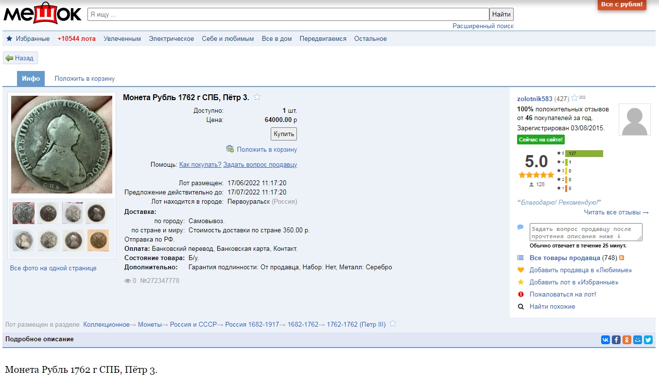 Монета представляет собой серебряный рубль 1762 года с вензелем Петра III и обозначением Санкт-Петербургского монетного двора (СПБ). Данный тип монет чеканился всего несколько месяцев, до дворцового переворота, и является редким. Представленный экземпляр — подделка, о чём прямо указано в посте и подтверждается ироничными комментариями сообщества, сравнивающими портрет с современными лицами.