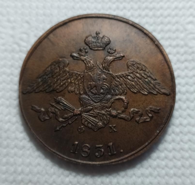 Монета 5 копеек 1831 года, отчеканенная при Николае I на Екатеринбургском монетном дворе (инициалы минцмейстера Ф. Хвощинского — ЕМ-ФХ). Данный экземпляр является современной копией, созданной для коллекционеров и не представляющей исторической и материальной ценности подлинной монеты.