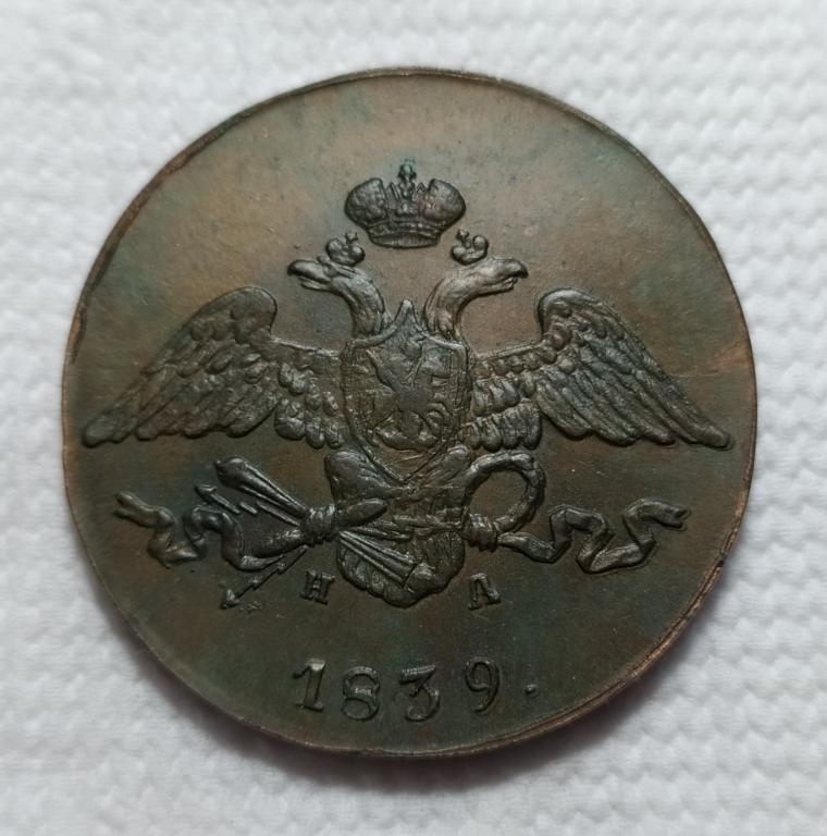 Монета 5 копеек 1835 года с инициалами минцмейстера ЕМ (Евдоким Молчанов), отчеканенная в период правления Николая I. В оригинале это медная монета регулярного чекана. Однако в самом посте автор прямо указывает, что это копия, что делает её современной репликой или сувениром, не имеющей нумизматической ценности.