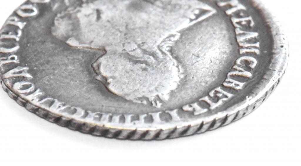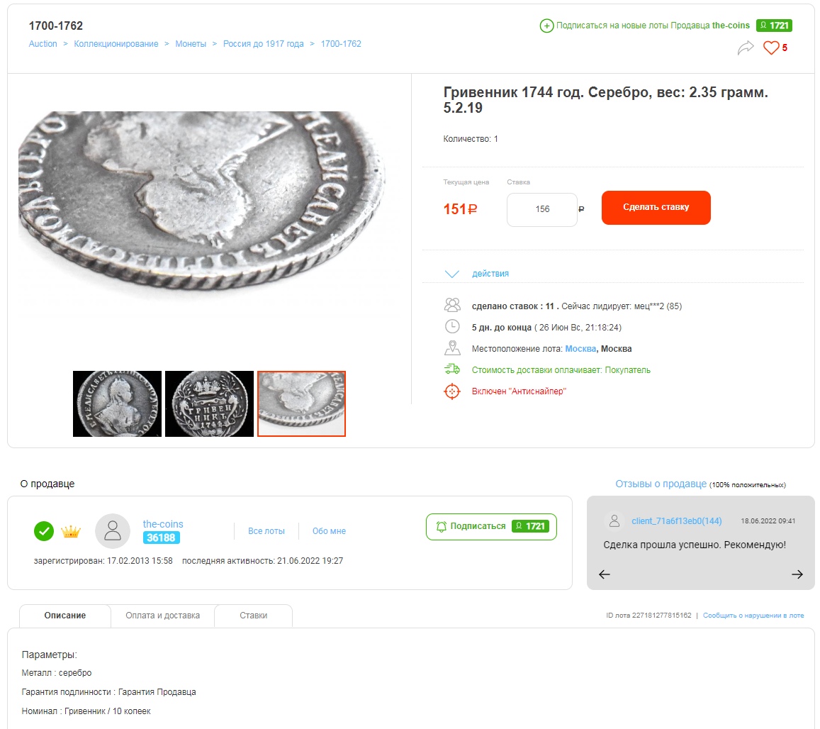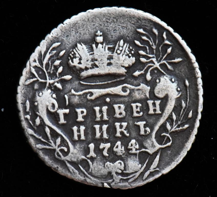 Монета представляет собой гривенник (10 копеек) времён правления императрицы Елизаветы Петровны, отчеканенный в 1744 году. Оригинальные монеты этого периода изготавливались из серебра и имеют высокую коллекционную ценность. Однако, как указано в посте, данная монета является фейком («фуфло»), то есть современной подделкой.