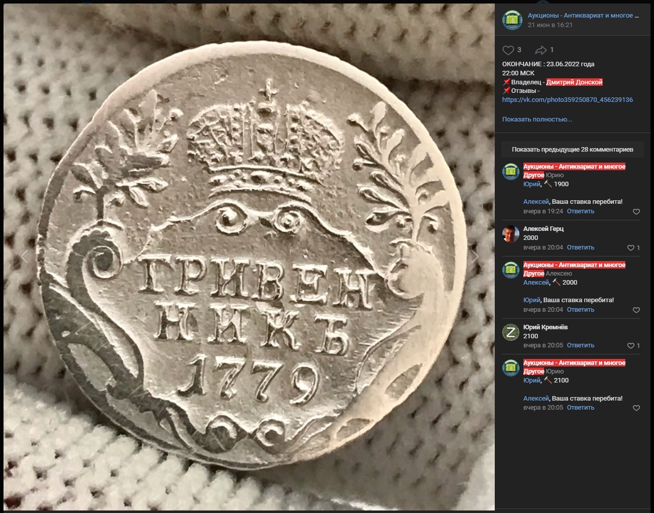 Монета представляет собой гривенник (10 копеек) 1779 года, отчеканенный в период правления императрицы Екатерины II. Судя по консенсусу в сообществе, это современная подделка (фуфло). Автор поста и комментаторы прямо указывают на её неоригинальность, отмечая, что продавец известен торговлей фальшивками.