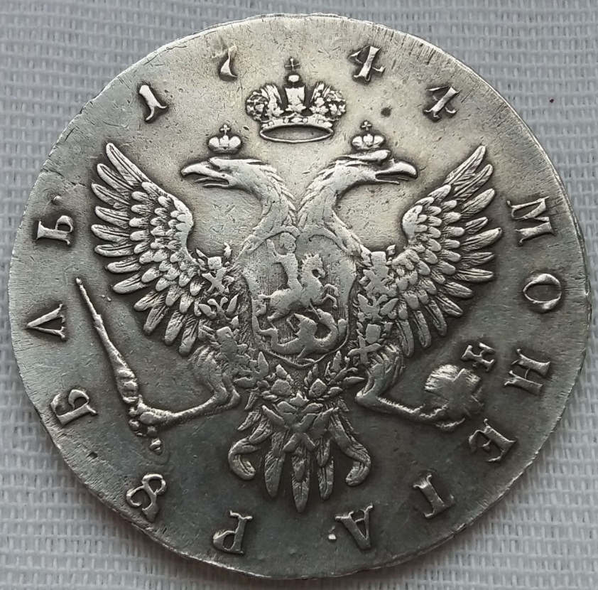 Монета представляет собой фейковую копию серебряного рубля 1744 года, отчеканенного в правление императрицы Елизаветы Петровны на Московском монетном дворе (ММД). Оригинальные рубли этого года являются редкими и ценными, что делает их частой мишенью для подделок. Автор поста прямо указывает, что представленный экземпляр — подделка.
