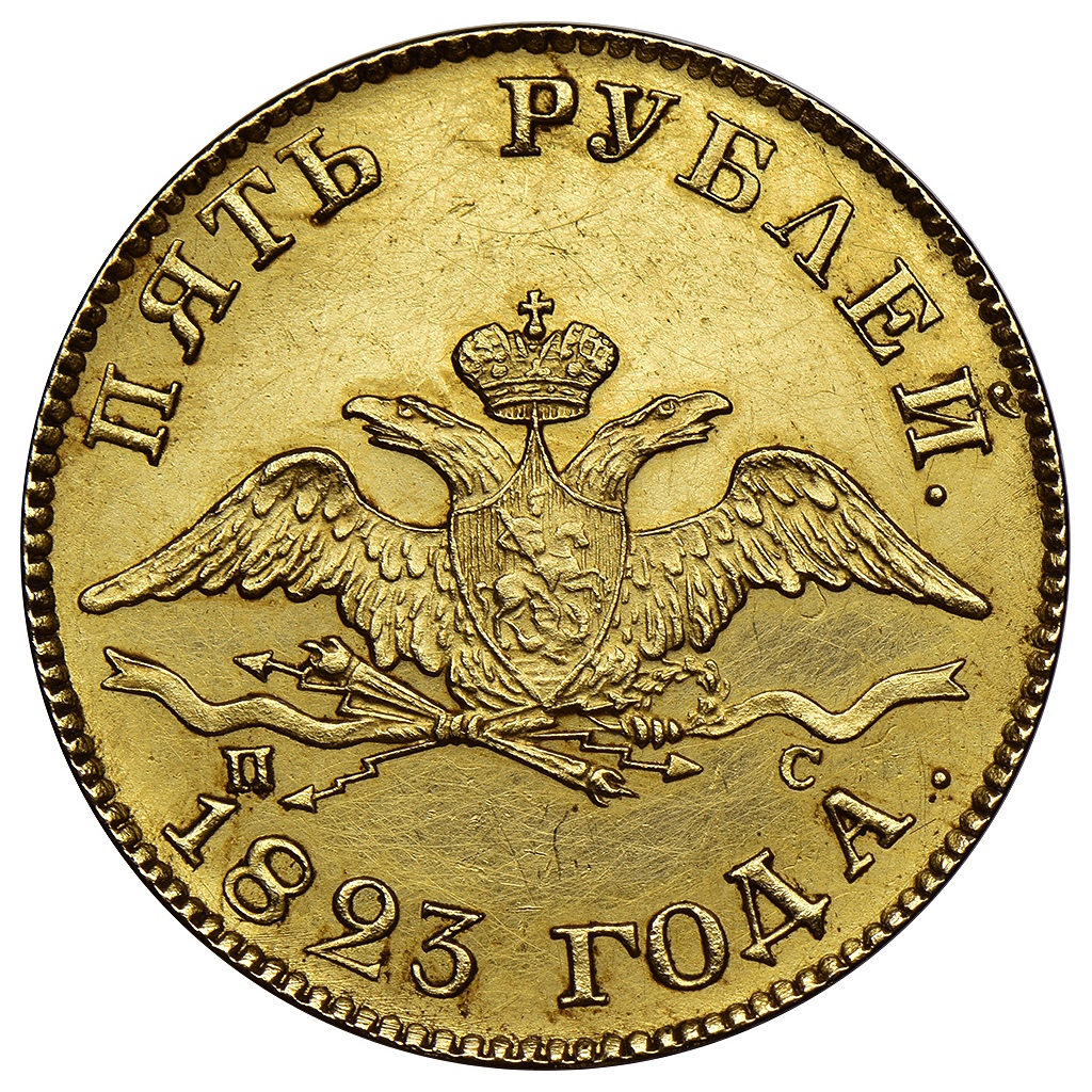 Монета 5 рублей 1823 года (СПБ-ПС) времён правления Александра I. Это современная подделка, отчеканенная с целью обмана коллекционеров. Фальшивка имеет неверный вес (6.51 г при норме ~6.54 г) и была массово представлена на западных аукционах, иногда даже попадая в слабы авторитетных грейдинговых компаний.