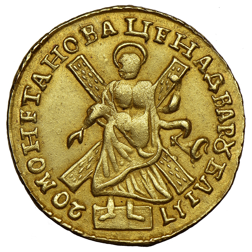 Монета номиналом 2 рубля 1720 года, отчеканенная в период правления Петра I. В публикации указано, что это подделка, представляющая опасность для коллекционеров из-за слоения металла на аверсе, что является признаком некачественного литья. Вес (4.10 г) и диаметр (19.7-20.3 мм) могут отличаться от оригинальных параметров.