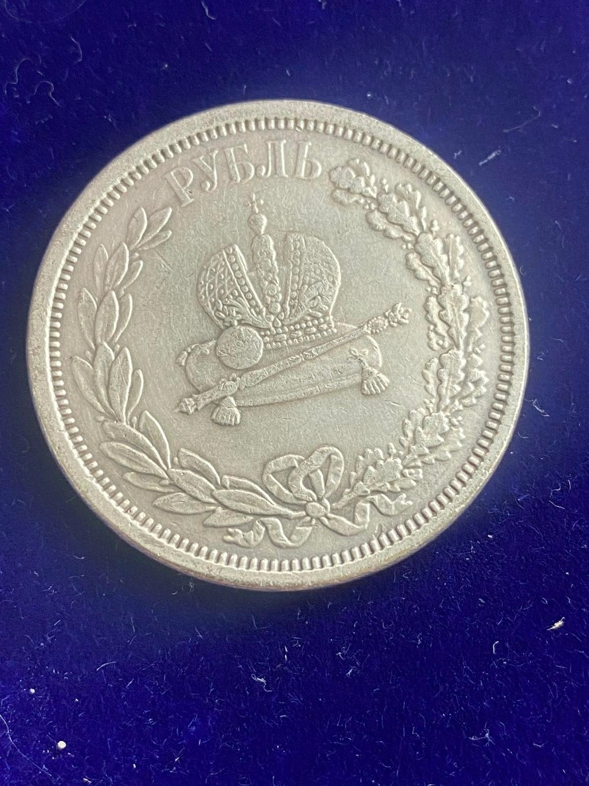Монета посвящена коронации императора Александра III. Оригинальный рубль 1883 года чеканился на Санкт-Петербургском монетном дворе из серебра 900-й пробы. Представленный экземпляр является грубой подделкой, о чём свидетельствуют многочисленные признаки литья, несоответствие веса и искажённые детали.