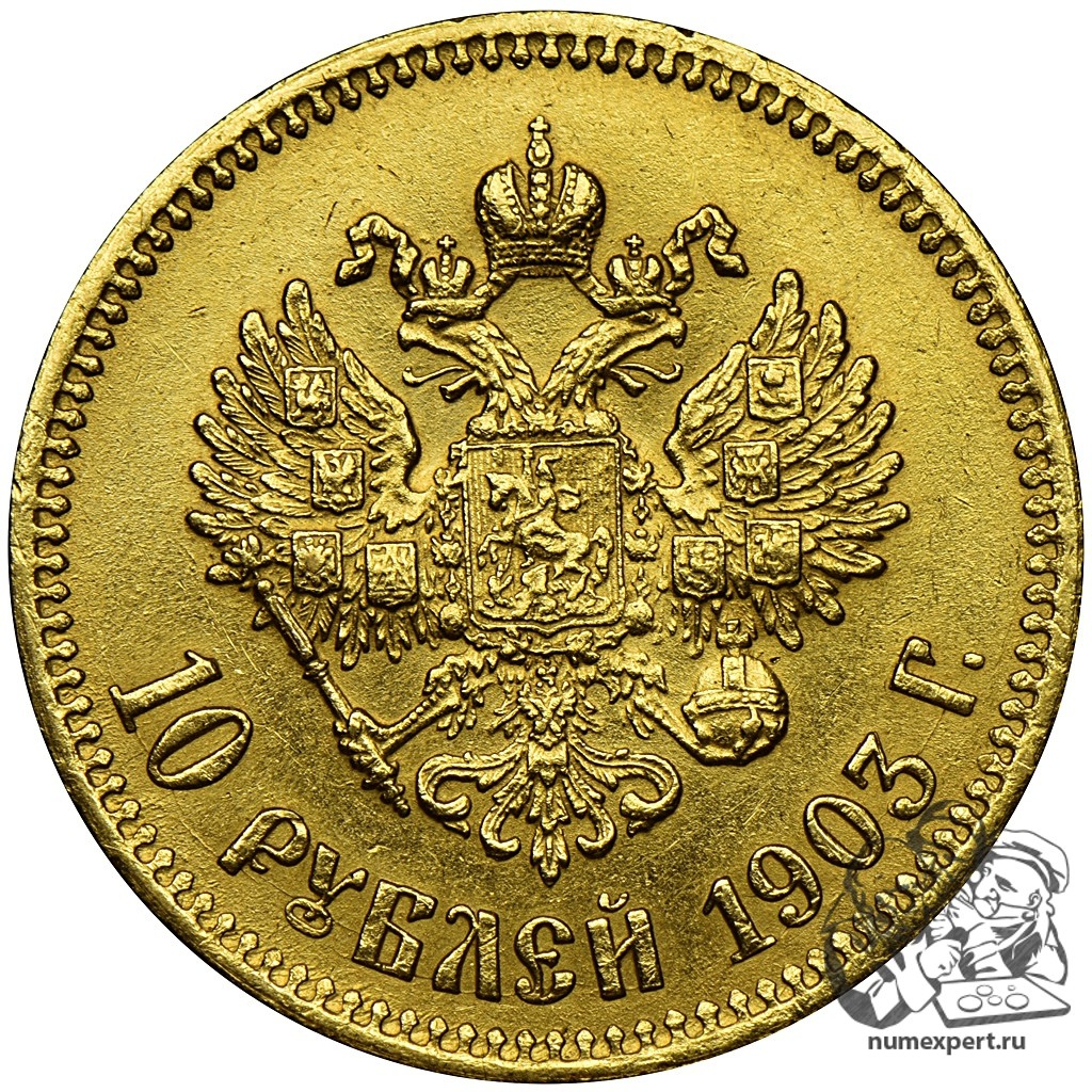 Монета номиналом 10 рублей 1903 года, отчеканенная в период правления Николая II. Представленный экземпляр является современной подделкой, зафиксированной экспертами. Вес (8.64 г) и диаметр (22.7 мм) не соответствуют стандартам оригинальной золотой монеты, что указывает на литьё или иной способ фальсификации.