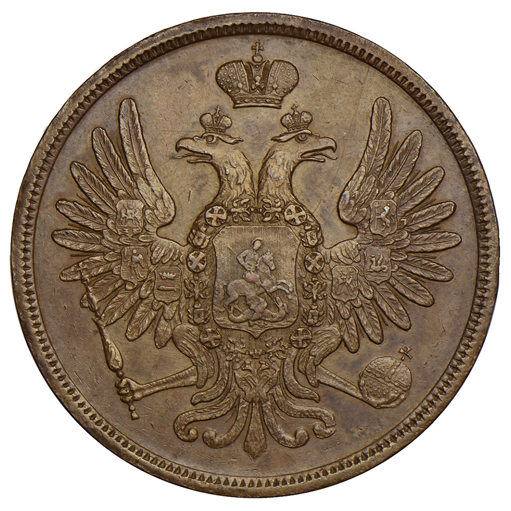 Медная монета номиналом 5 копеек 1849 года, отчеканенная на Санкт-Петербургском монетном дворе (СПМ) в период правления Николая I. Представленный экземпляр является современной высококачественной подделкой, зафиксированной экспертами в 2017 году. Фальшивка представляет высокую опасность для коллекционеров из-за тщательной проработки деталей и весовых характеристик, приближенных к оригиналу.