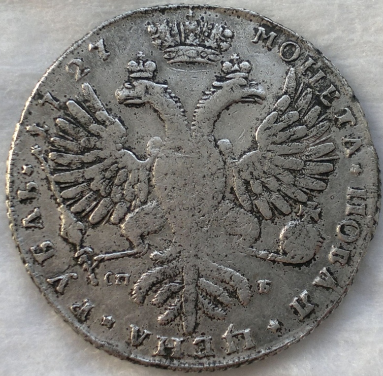 Монета представляет собой подделку рубля 1727 года, отчеканенного при императрице Екатерине I на Санкт-Петербургском монетном дворе. Оригинальные рубли этого периода изготавливались из серебра и имеют высокую коллекционную ценность. Представленный экземпляр является современной сувенирной копией низкого качества, что подтверждается единодушным мнением сообщества.