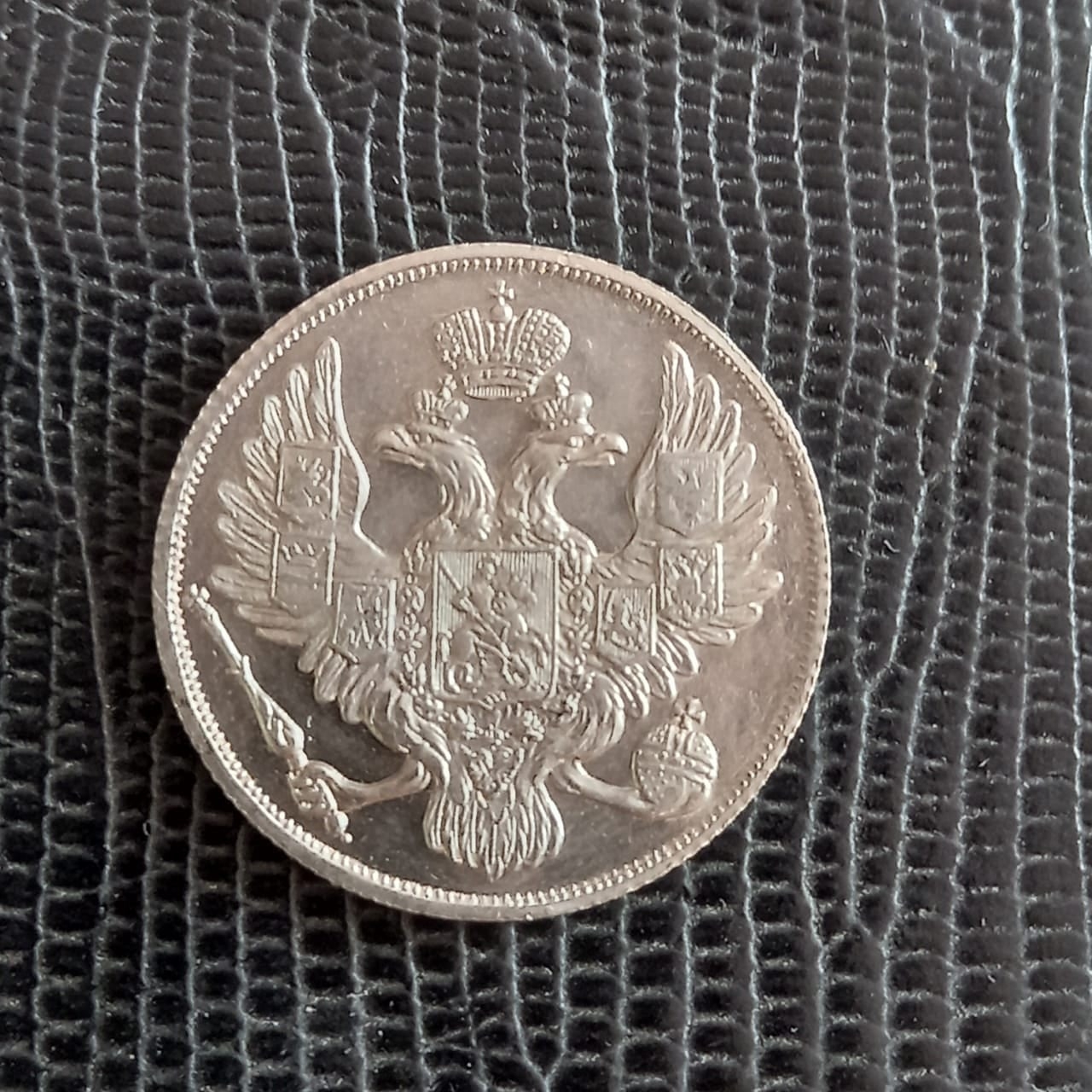 Представленная монета — платиновые 3 рубля 1835 года, отчеканенные в правление Николая I. Подлинные экземпляры этой серии крайне редки и ценны. Данный экземпляр является грубой подделкой, о чём свидетельствуют некачественные детали и ошибки в легенде.