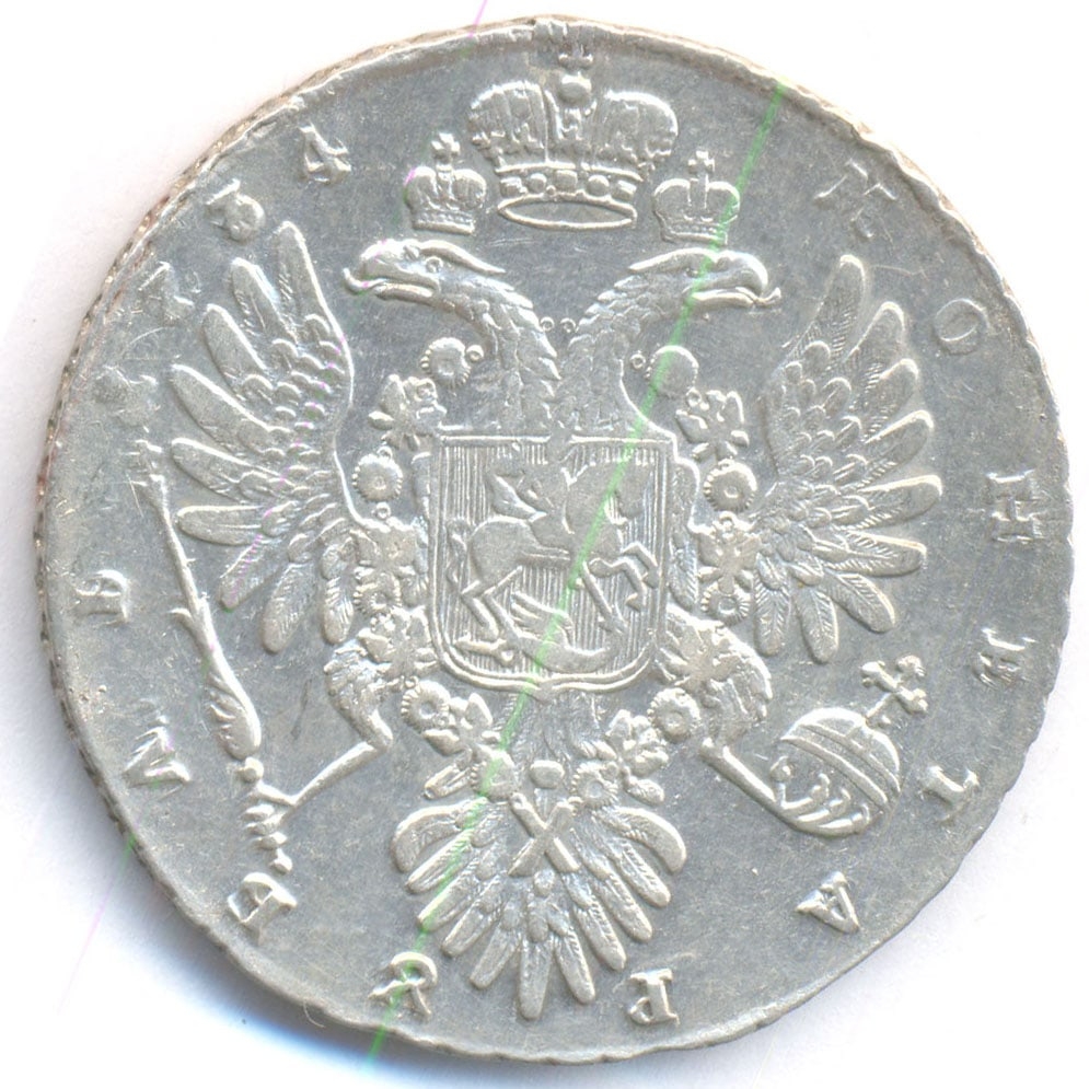 Серебряный рубль 1734 года, отчеканенный в правление императрицы Анны Иоанновны. Монета данного типа и года выпуска является желанным экземпляром для коллекционеров, но часто подделывается. Без экспертной оценки по качественным фотографиям или вживую определить подлинность невозможно.