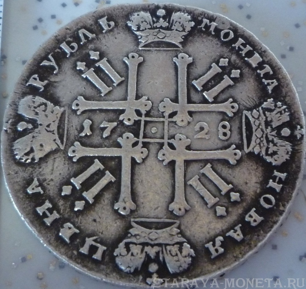 Монета номиналом 1 рубль 1728 года, отчеканенная в правление императора Петра II. Данный экземпляр является подделкой, о чём прямо указано в описании поста. Подлинные рубли этого года редки и имеют высокую коллекционную ценность, что делает их частой мишенью для фальсификаторов.