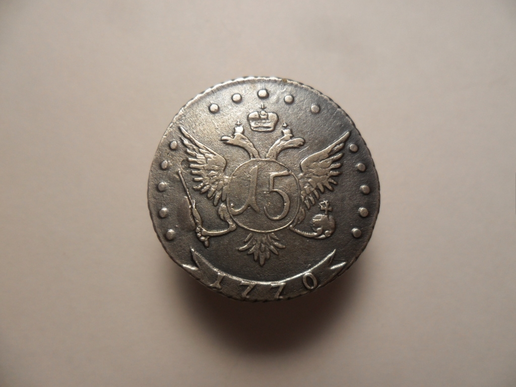 Монета представляет собой копию серебряных 15 копеек периода правления Екатерины II, отчеканенных на Московском монетном дворе (ММД). Оригинальные монеты этого типа имеют высокую коллекционную ценность. В самом посте автор прямо указал, что это копия, что однозначно определяет её как не подлинник.
