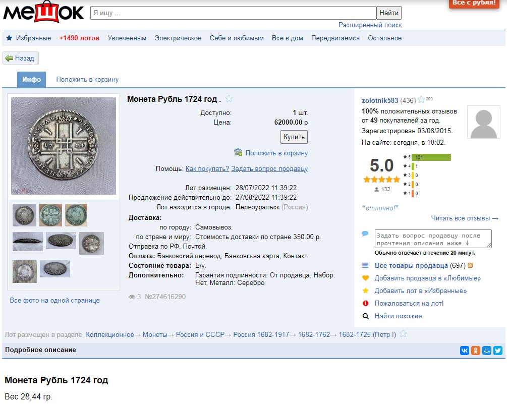 Монета представляет собой копию серебряного рубля 1724 года, отчеканенного в период правления Петра I. Оригинальные рубли этого года имеют высокую коллекционную ценность и встречаются редко. В посте автор прямо указывает, что это подделка, что является основным фактором для определения.