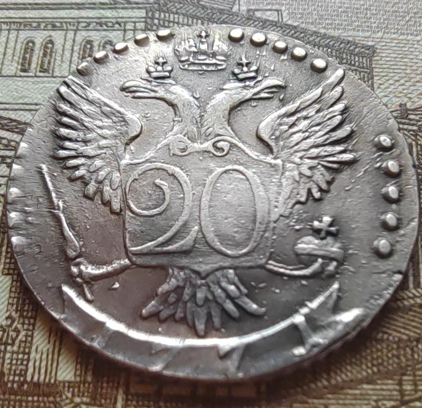 Монета 20 копеек 1771 года с монограммой Екатерины II и знаком Санкт-Петербургского монетного двора (СПБ). Судя по консенсусу в комментариях и формулировке автора поста, данная монета является подделкой, вероятно, выполненной методом литья.