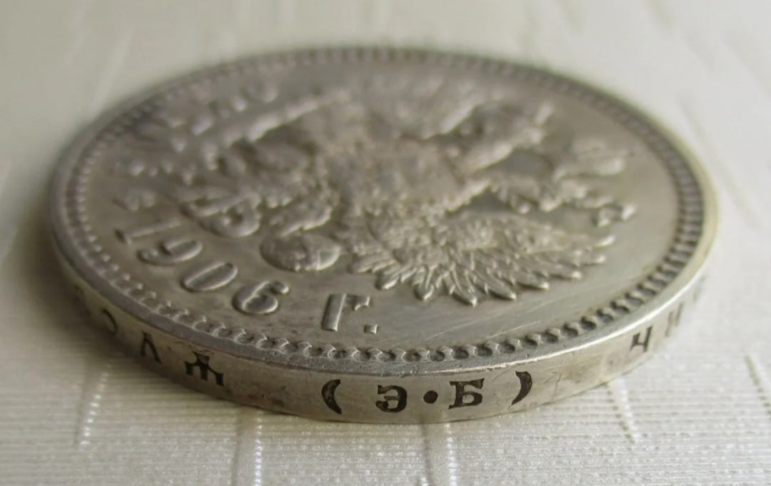 Серебряный рубль 1906 года с портретом императора Николая II. Монета имеет признаки искусного литья или чеканки копированным штемпелем. Несмотря на привлекательный вид, эксперты отмечают ряд несоответствий оригинальной чеканке, что указывает на подделку.