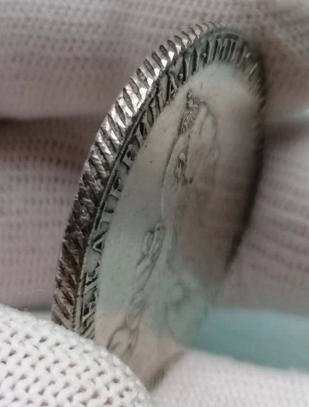 Монета представляет собой копию серебряного рубля времён Екатерины II, отчеканенного на Санкт-Петербургском монетном дворе (обозначение СПБ). В оригинале это редкая и ценная монета, что делает её частой мишенью для фальсификаторов. В данном случае автор поста прямо указывает, что это подделка, что исключает сомнения в её неподлинности.