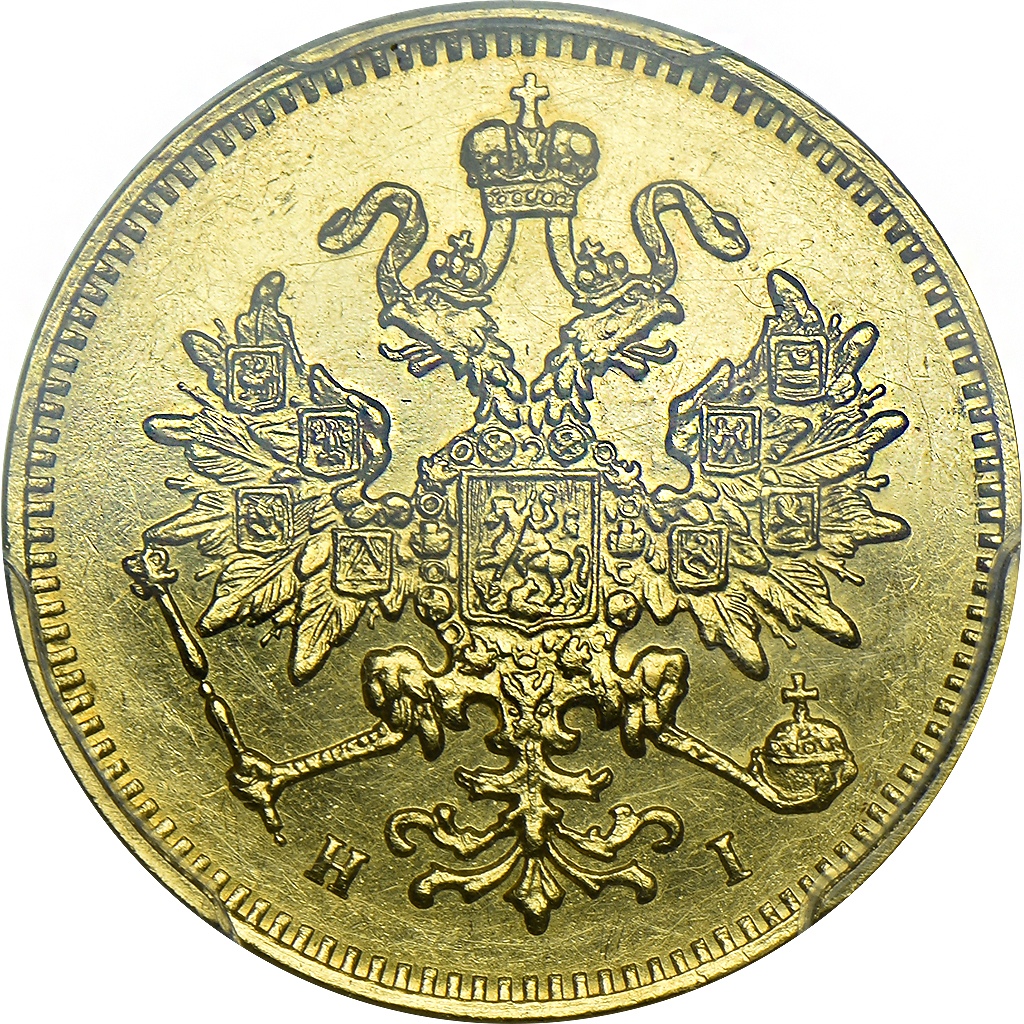 Золотая монета номиналом 3 рубля 1870 года, отчеканенная в период правления Александра II. Это известная на рынке высококачественная подделка, выполненная из драгоценного металла и упакованная в сертифицированный слаб PCGS. Экземпляр представляет серьёзную опасность для коллекционеров из-за своего качества и наличия поддельного сертификата.