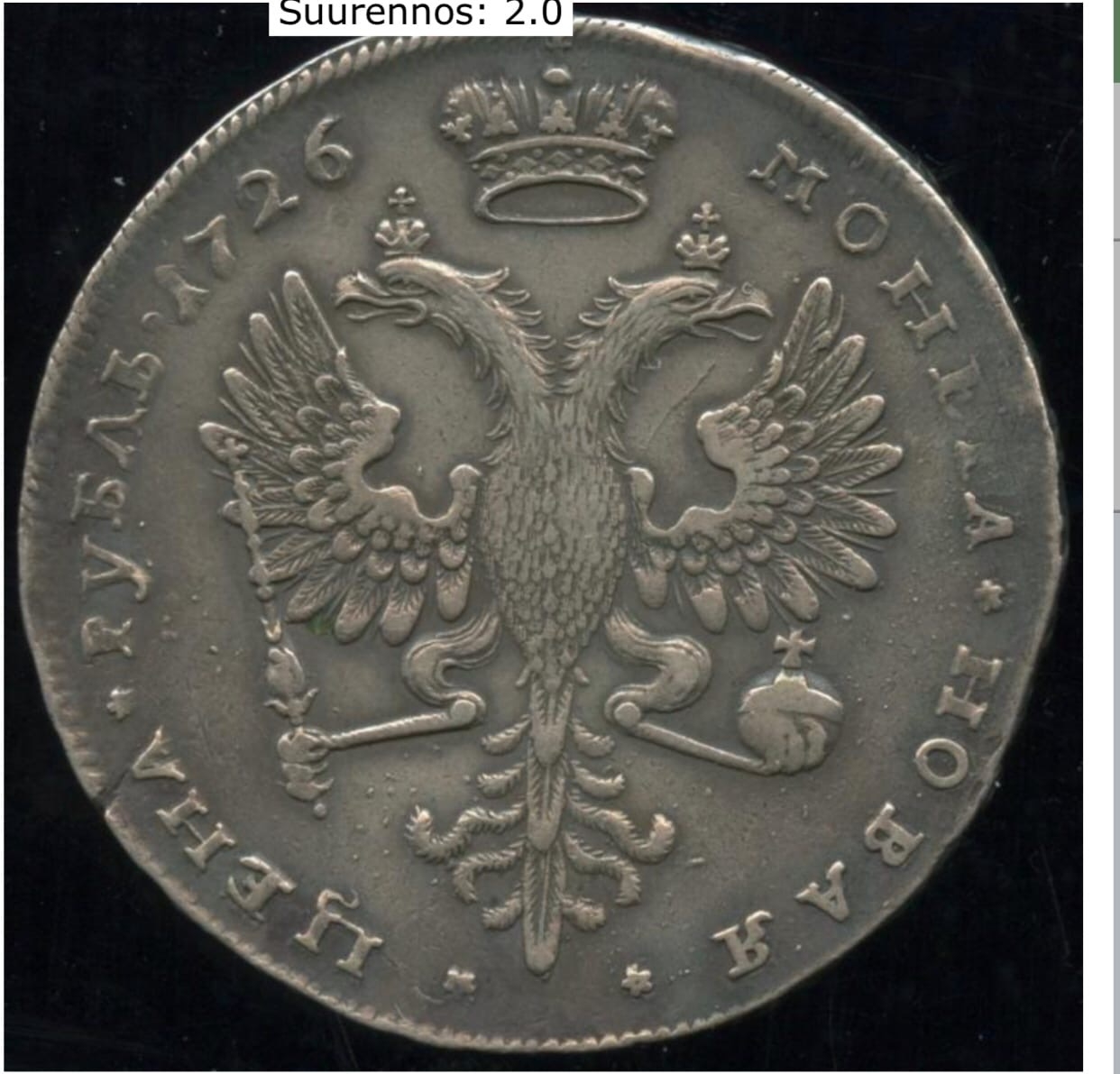 Монета представляет собой фальшивый рубль 1726 года, отчеканенный в правление Екатерины I. Подделка выполнена методом литья под давлением, что видно по просадкам рельефа, мелкой пористости поля и искусственной патине. Неестественные сочетания сильного износа с сохранением мелких деталей также выдают копию.