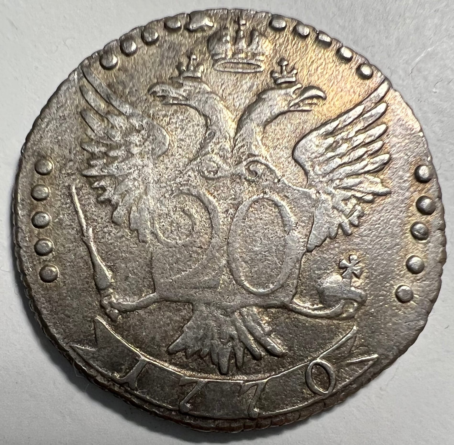 Монета 20 копеек 1770 года, отчеканенная в период правления Екатерины II из серебра. Судя по консенсусу в комментариях, представленный экземпляр является подделкой. Эксперты указывают на несоответствие штемпеля (СПБ-ТI), гурта и вероятный литой способ изготовления.