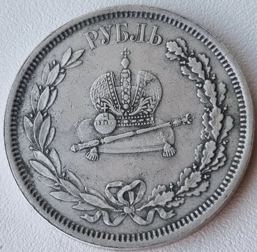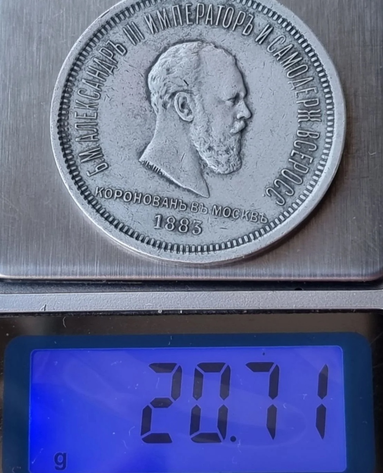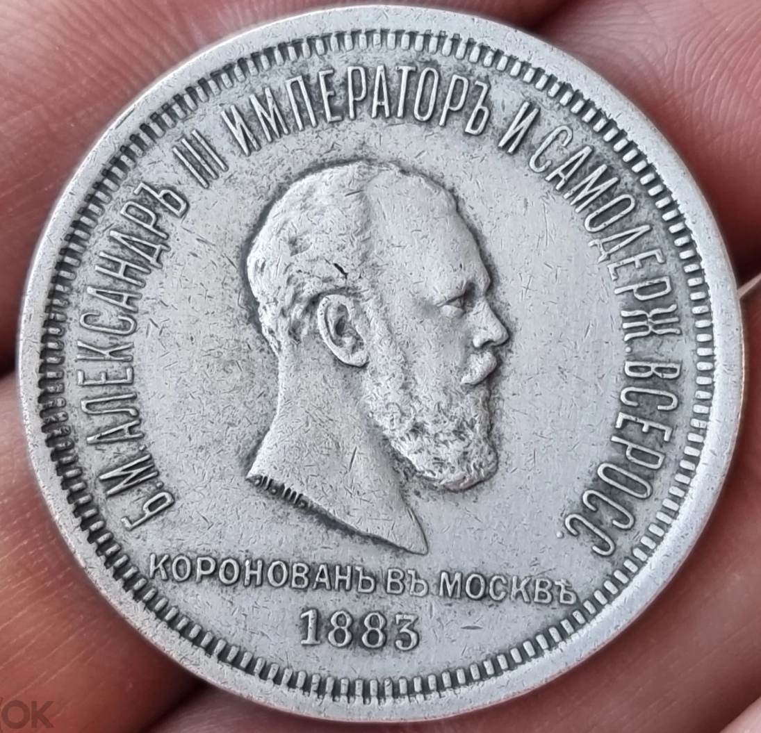 Монета посвящена коронации императора Александра III. Оригинальный рубль 1883 года чеканился из серебра 900-й пробы и является ценной нумизматической редкостью. В данном случае представлена откровенная копия, как указано в описании поста, что делает её интересным сувениром, но не подлинником.
