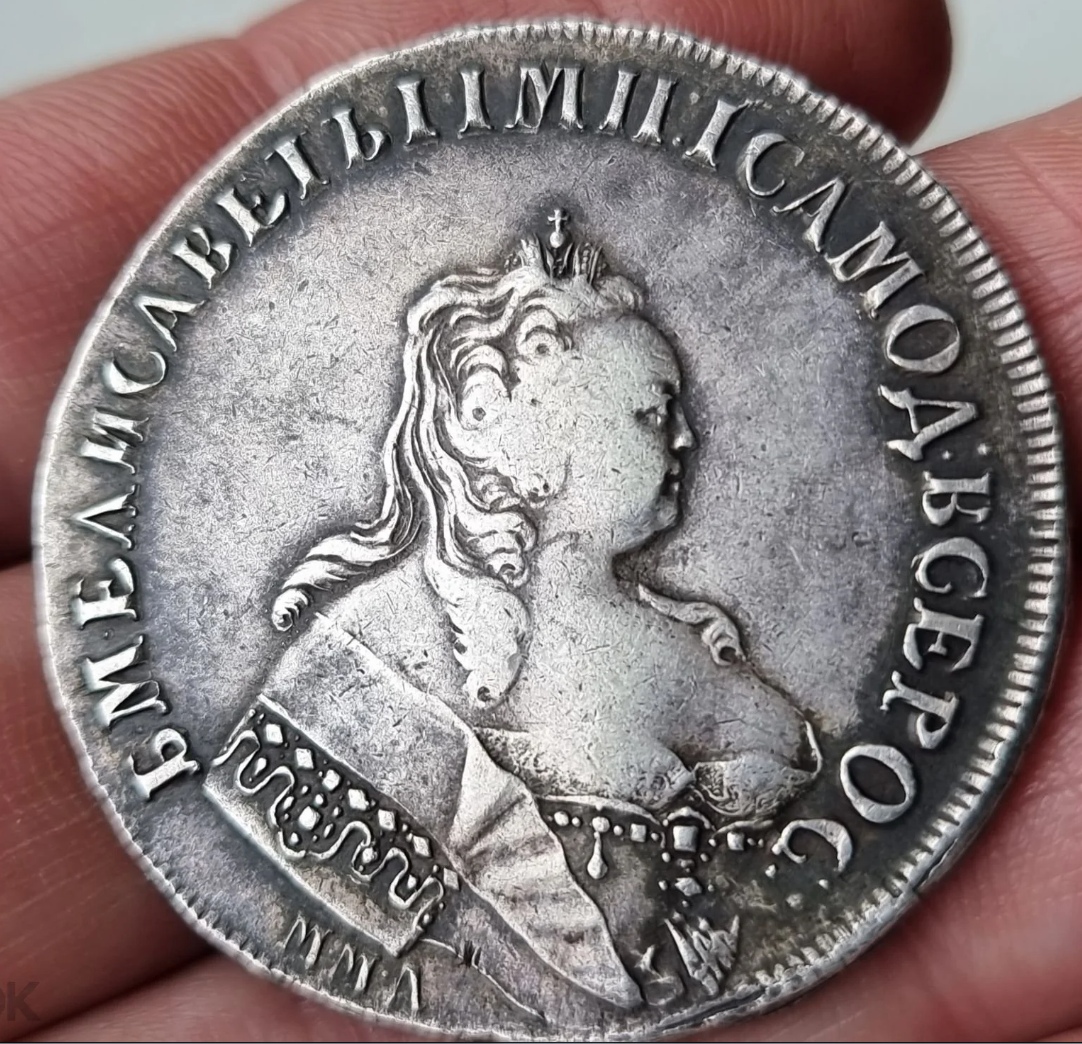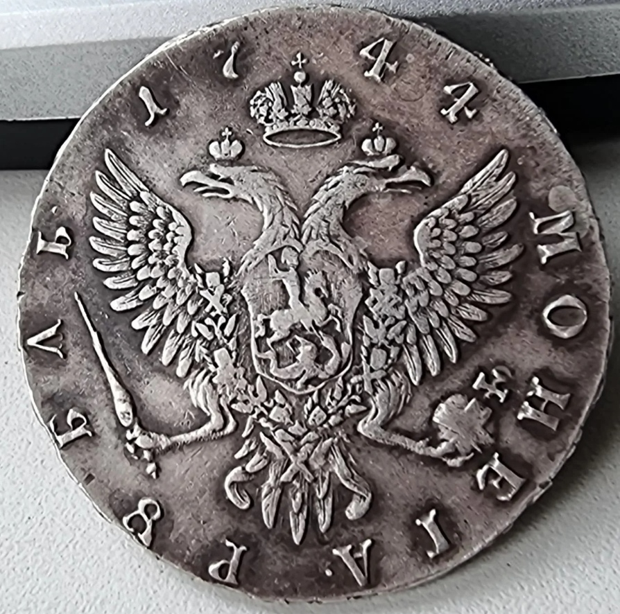 Монета представляет собой копию серебряного рубля 1744 года, отчеканенного при императрице Елизавете Петровне на Московском монетном дворе (ММД). Оригинальные монеты этого типа высоко ценятся коллекционерами. Представленный экземпляр является современной репликой, о чём прямо указано в посте и подтверждено комментариями.