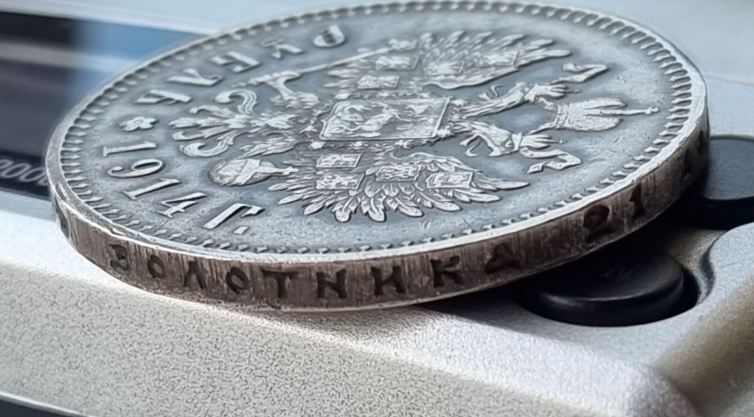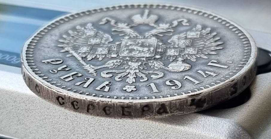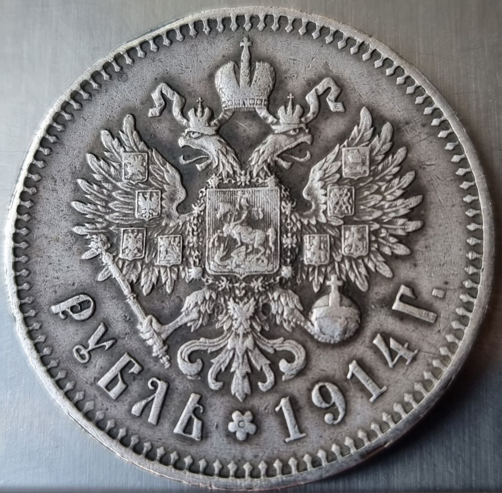 Монета представляет собой копию серебряного рубля 1914 года, выпущенного в правление императора Николая II. Оригиналы чеканились на Санкт-Петербургском монетном дворе. Представленный экземпляр является подделкой, о чём прямо указано в посте и подтверждено в комментариях.
