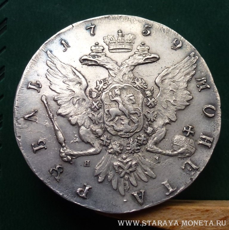 Монета представляет собой копию серебряного рубля 1759 года периода правления императрицы Елизаветы Петровны. Оригинальные рубли этого периода чеканились на Санкт-Петербургском монетном дворе и имеют высокую коллекционную ценность. В данном случае, как указано в посте, это подделка, не имеющая нумизматической ценности.