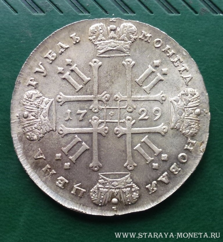 Монета представляет собой копию редкого рубля 1729 года, отчеканенного в период правления Петра II. Оригинальные экземпляры этого года чрезвычайно редки и ценны, что делает их частой мишенью для подделок. В данном случае автор поста прямо указывает, что монета является подделкой, что подтверждается консенсусом в комментариях.