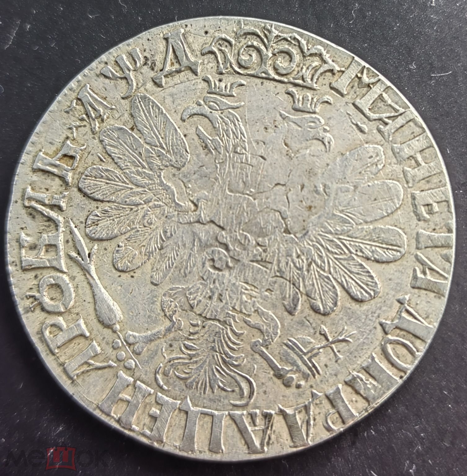 Монета является копией редкого серебряного рубля эпохи Петра I, отчеканенного в 1704 году. Оригиналы этого периода имеют высокую коллекционную ценность и встречаются крайне редко. В посте прямо указано, что это копия, что исключает её подлинность.