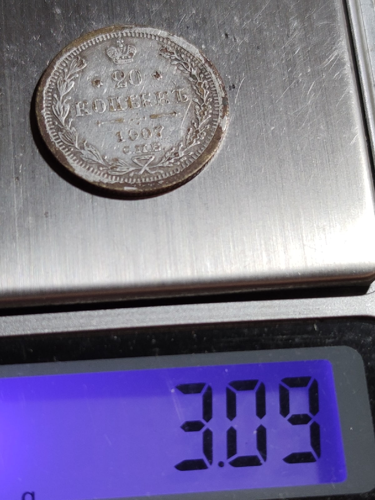 Монета номиналом 20 копеек 1907 года, отчеканенная в период правления императора Николая II. Судя по консенсусу в комментариях, представленный экземпляр является подделкой, вероятно, современной или изготовленной в ущерб коллекционерам. Признаки, такие как неестественный вид поверхности, указывают на литьё или иной кустарный способ производства.
