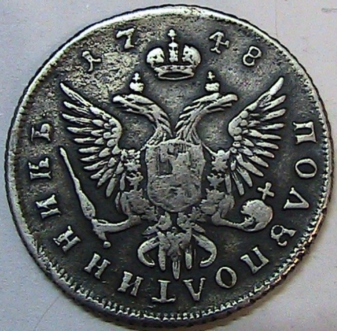 Полуполтинник (25 копеек) 1748 года, отчеканенный в период правления императрицы Елизаветы Петровны. Оригинальная монета изготавливалась из серебра 802-й пробы. Представленный экземпляр является современной копией, о чём прямо указано в описании поста.
