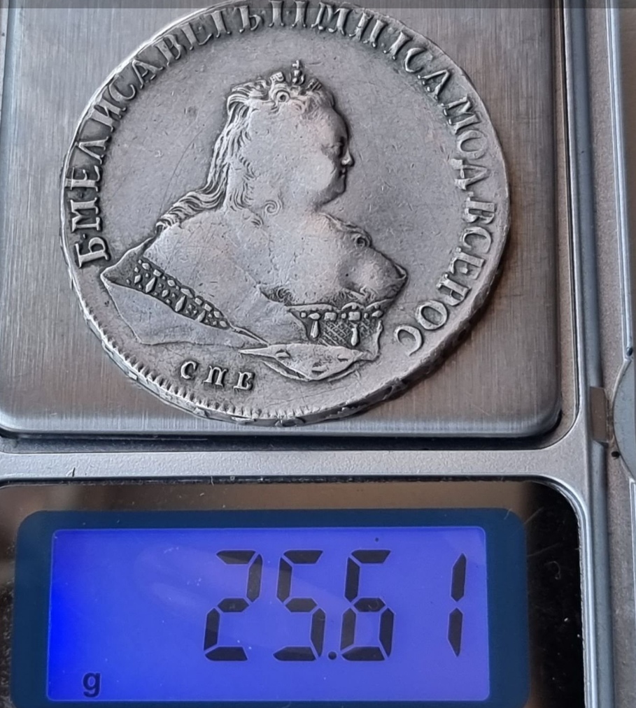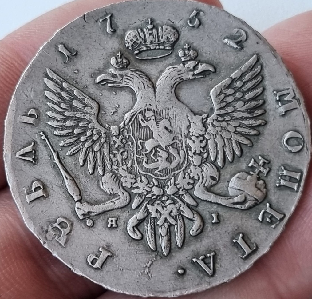 Монета представляет собой копию серебряного рубля 1752 года, отчеканенного при императрице Елизавете Петровне на Санкт-Петербургском монетном дворе (обозначение СПБ). Оригинальные рубли этого года являются редкими и ценными коллекционными экземплярами. Представленный экземпляр является современной репликой, о чём прямо указано в посте и подтверждено комментариями.