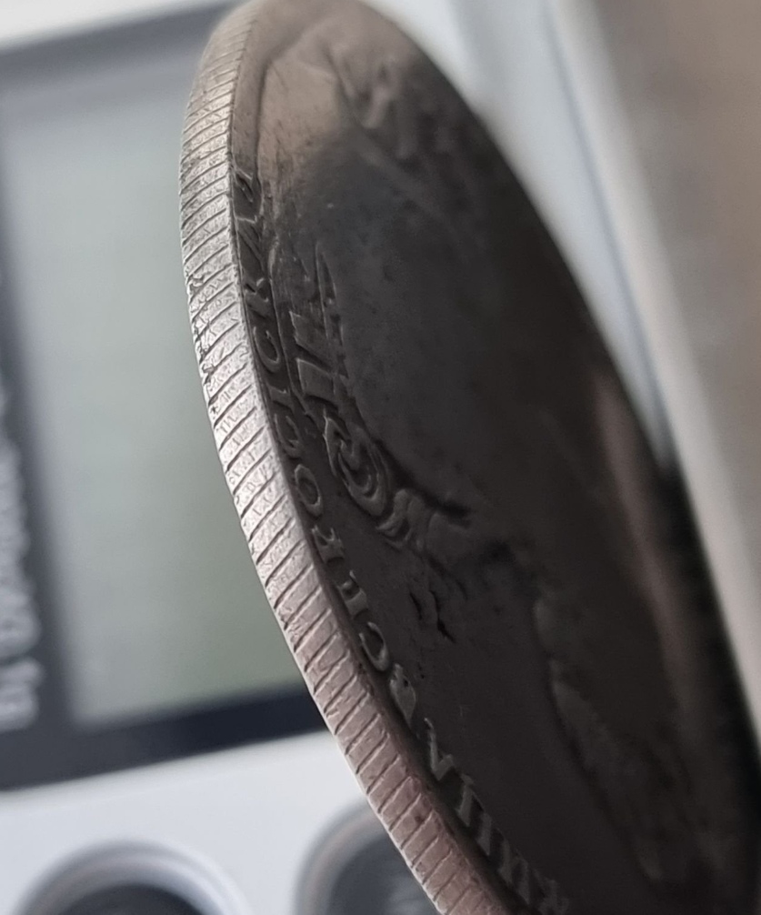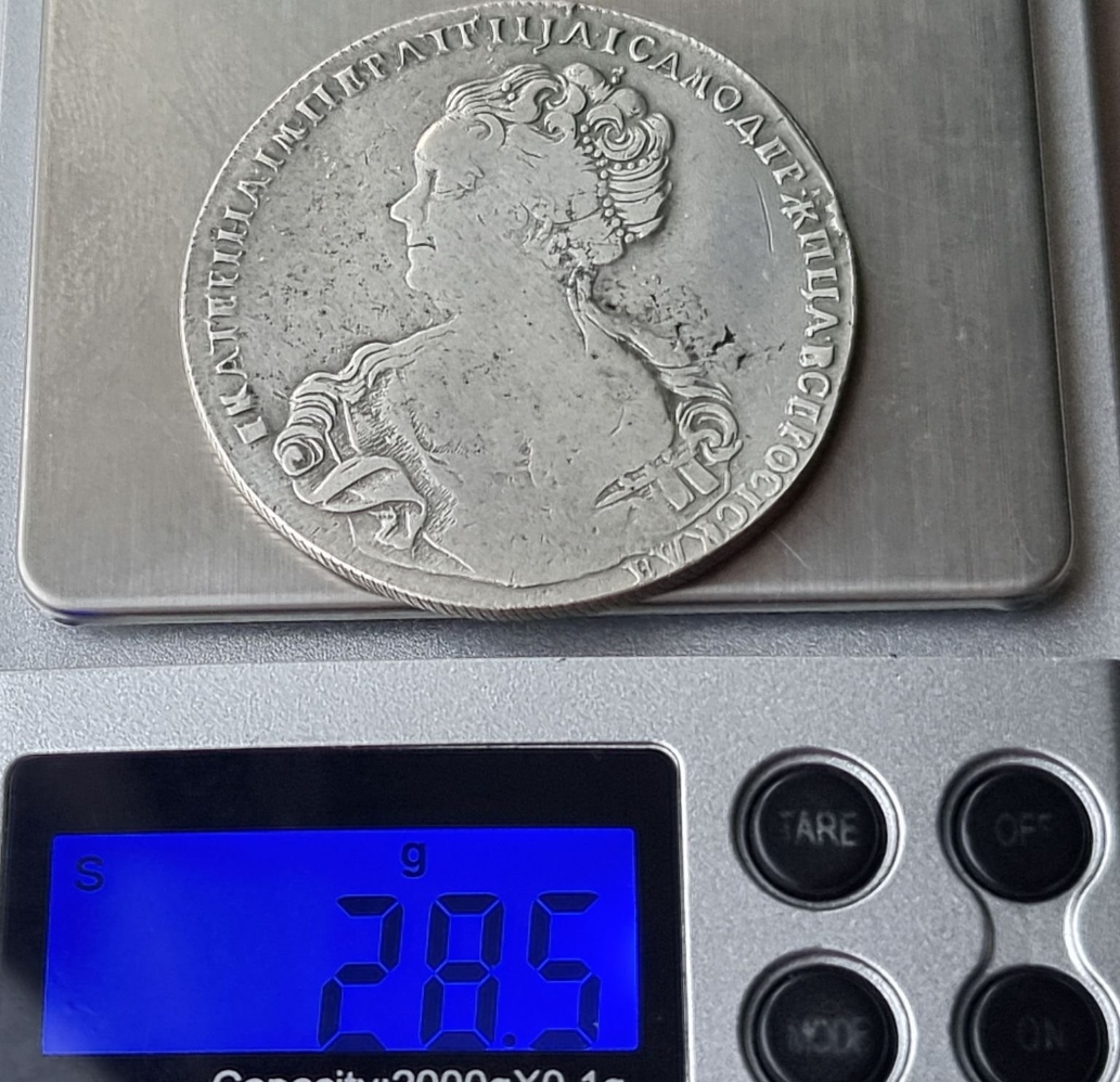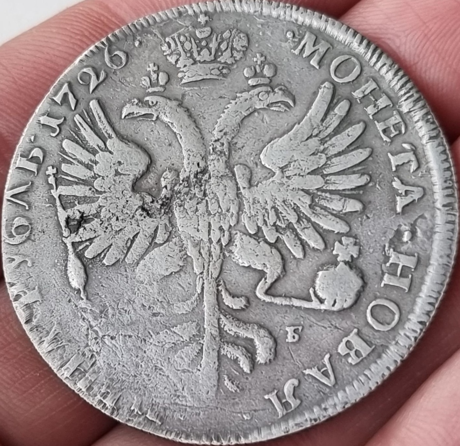 Монета представляет собой копию серебряного рубля 1726 года, отчеканенного в Санкт-Петербурге при императрице Екатерине I. Оригинальные монеты этого типа имеют высокую коллекционную ценность. Представленный экземпляр является фейком, о чём прямо указано в посте и подтверждено в комментариях.