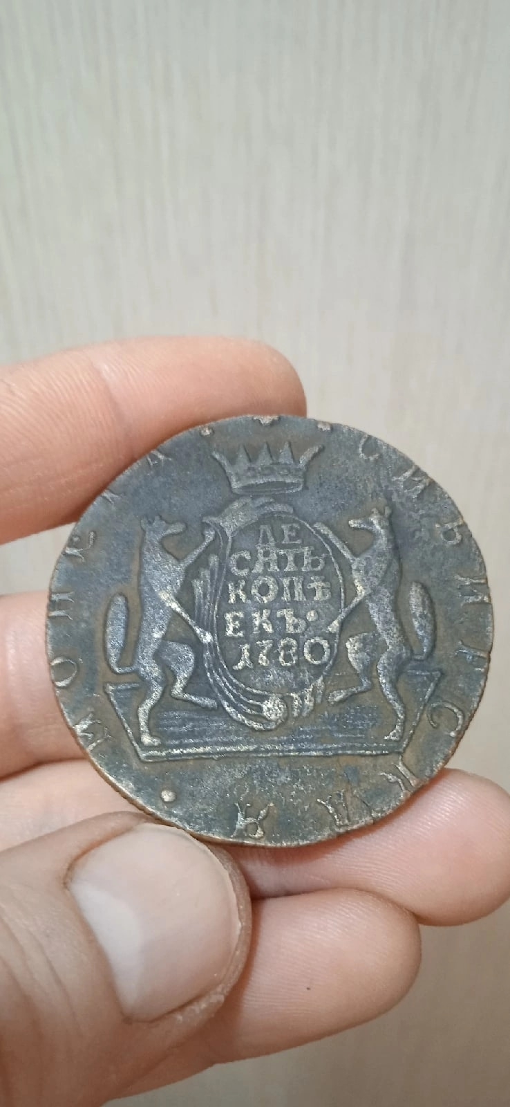 Монета 10 копеек 1780 года, так называемая «сибирская монета», чеканившаяся на Сузунском монетном дворе из колыванской меди. Представленный экземпляр является подделкой. На это указывают неправильный цвет металла (похожий на латунь), сомнительная фактура поверхности и детали, не соответствующие оригинальным штемпелям, такие как корона.