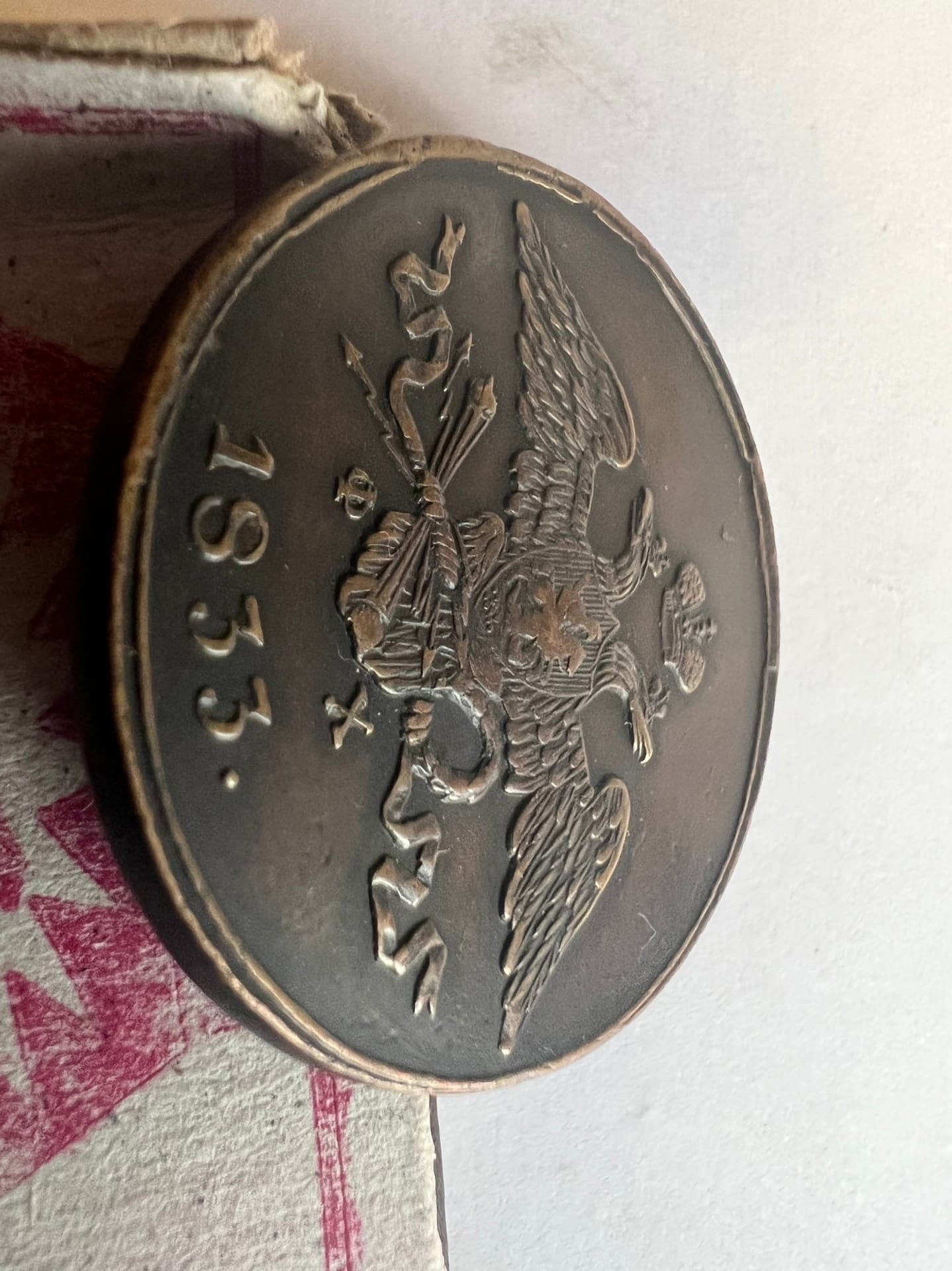 Медная монета 5 копеек 1833 года, отчеканенная на Екатеринбургском монетном дворе (инициалы минцмейстера Ф. Хвощинского — ЕМ-ФХ). Монета является современной подделкой, о чём свидетельствуют несоответствия в деталях гурта, глянцевые и закруглённые элементы рельефа, а также искажённое изображение земляного холма под всадником.