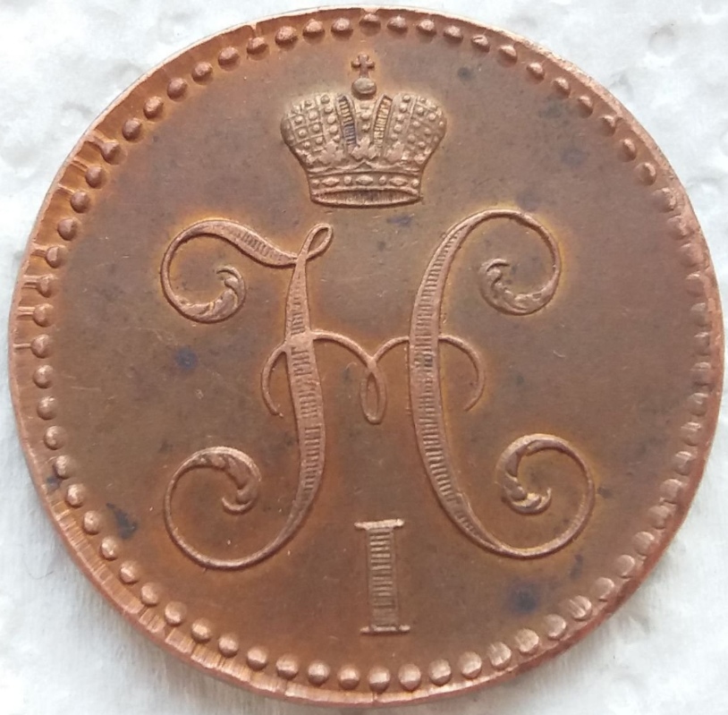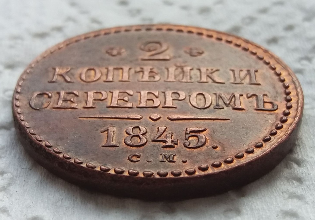 Монета номиналом 2 копейки 1845 года, отчеканенная в период правления императора Николая I. Оригинальные монеты этого типа чеканились из меди на Екатеринбургском монетном дворе. Представленный экземпляр является копией, о чём прямо указано в описании поста.