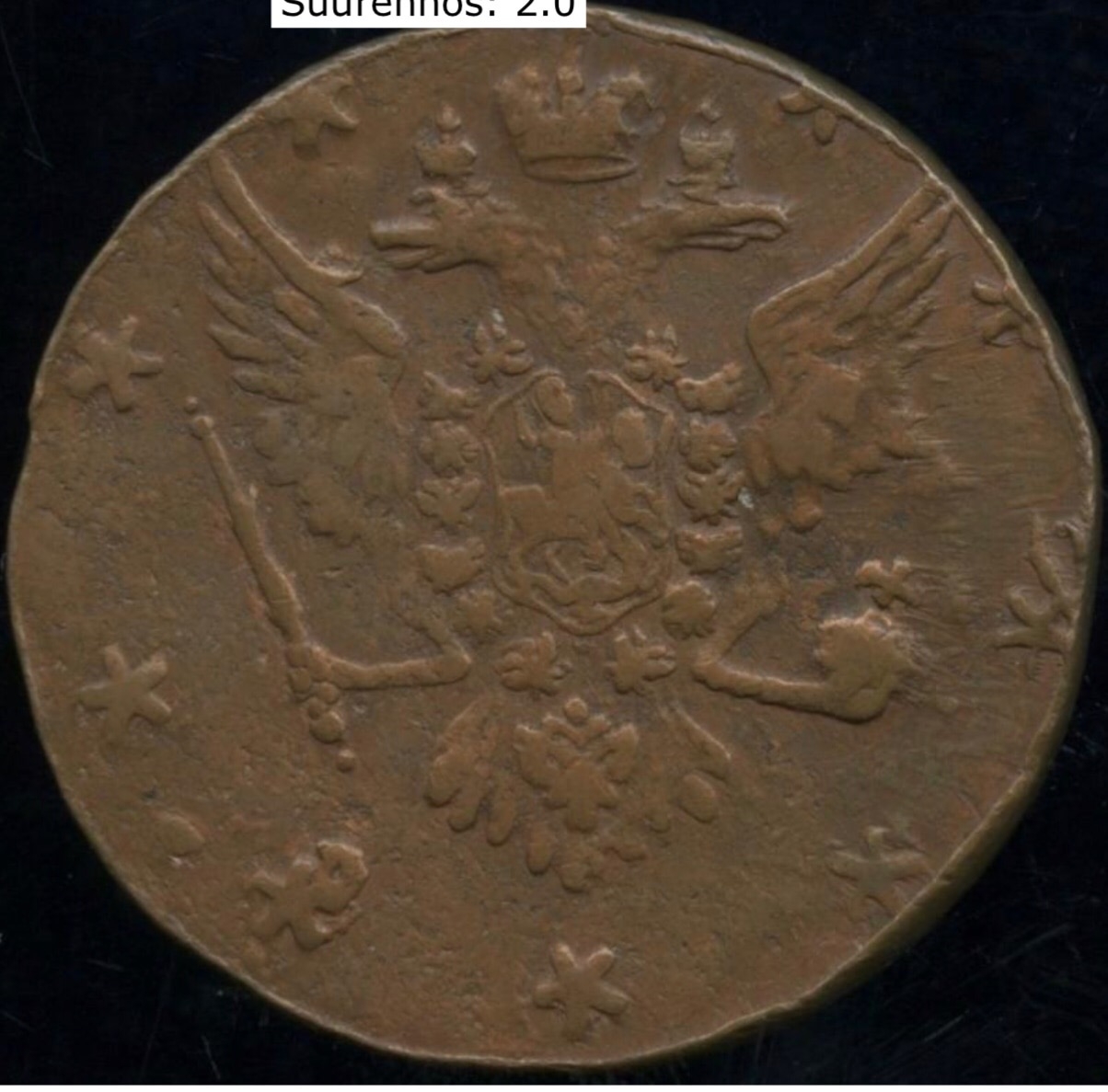 Монета номиналом 10 копеек (гривенник) 1762 года, отчеканенная в краткое правление императора Петра III из серебра. Представленный экземпляр является фальшивкой, о чём свидетельствуют грубые ошибки в деталях. Неправильные, «пляшущие» буквы и цифры, а также сомнительное изображение орла не соответствуют технологиям и стилистике подлинных монет того периода.