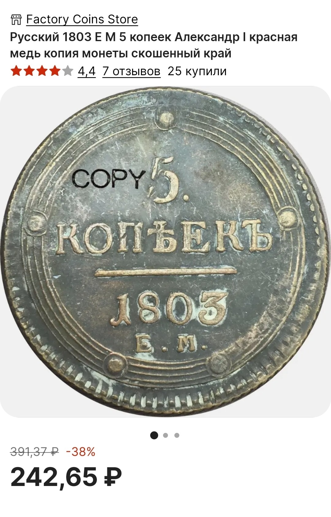 Монета представляет собой копию медных 5 копеек 1803 года, отчеканенных на Екатеринбургском монетном дворе (знак «ЕМ»). Оригинальные монеты этого типа весили около 51 грамма. Данный экземпляр является фейком, так как автор поста прямо указывает на его поддельность, называет «фуфелом» и отмечает аномально большой вес около 65 грамм, что не соответствует стандартам.