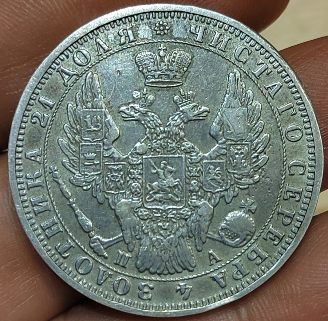 Рубль 1851 года СПБ-ПА — подделка из мельхиора