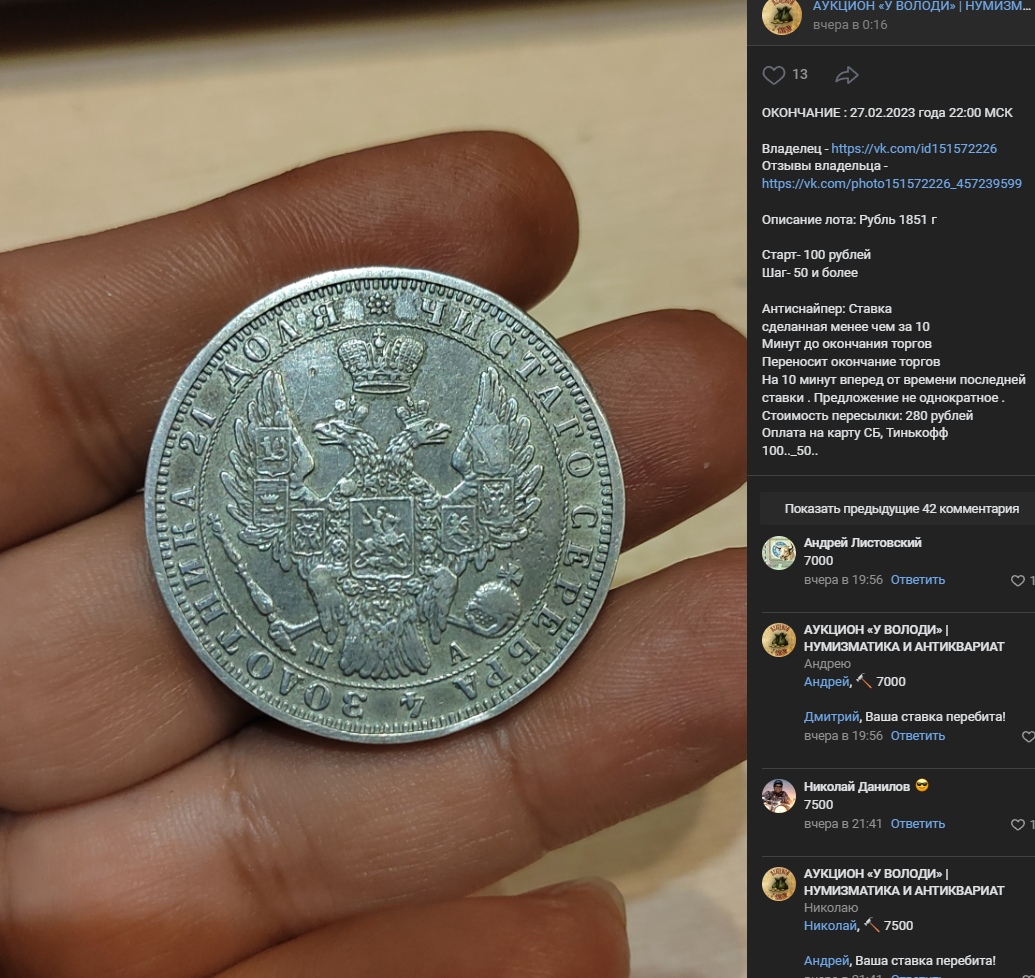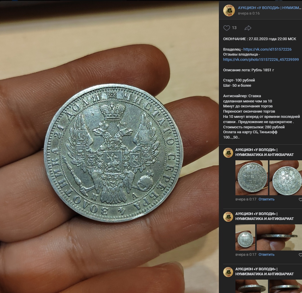 Монета представляет собой копию серебряного рубля 1851 года, отчеканенного в правление Николая I на Санкт-Петербургском монетном дворе (инициалы минцмейстера Павла Алексеева — ПА). Оригинальная монета изготавливалась из серебра 868-й пробы. Данный экземпляр признан фейком, так как, согласно комментариям, был продан как изделие из мельхиора по низкой цене, что не соответствует характеристикам подлинника.