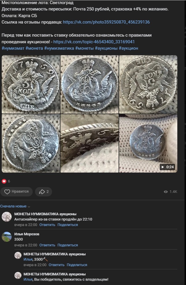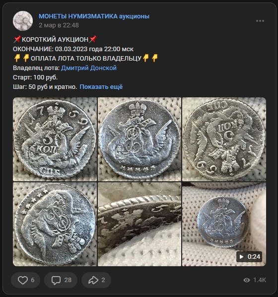 Монета 5 копеек 1759 года с монограммой СПБ (Санкт-Петербургский монетный двор) была отчеканена в период правления императрицы Елизаветы Петровны. Данный экземпляр является подделкой, о чём прямо указано в описании поста. Подобные медные монеты XVIII века часто копируют из-за высокого спроса коллекционеров.