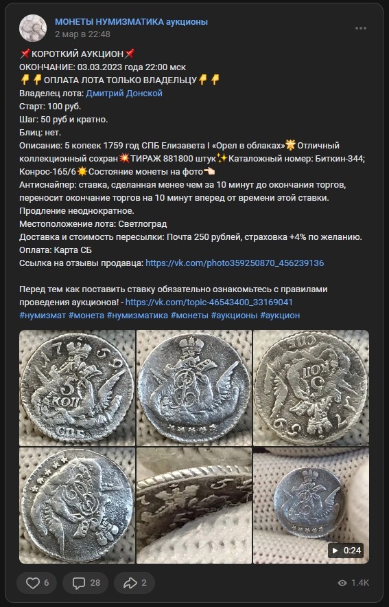 5 копеек 1759 года СПБ — поддельная монета Елизаветы Петровны
