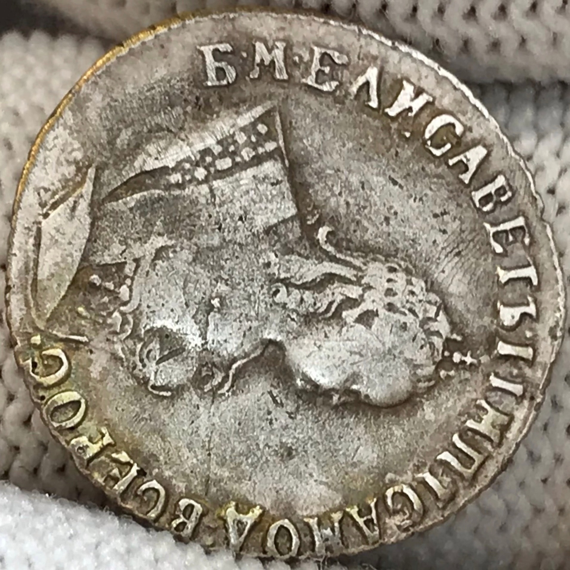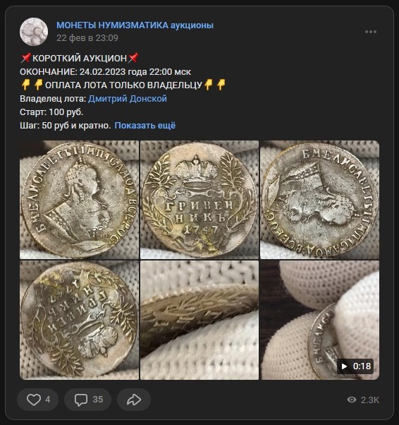 Монета представляет собой гривенник (10 копеек) времён правления императрицы Елизаветы Петровны, отчеканенный в 1747 году. Оригинальные монеты этого периода изготавливались из серебра и имеют высокую коллекционную ценность. Представленный в посте экземпляр является подделкой, о чём прямо указал автор публикации.