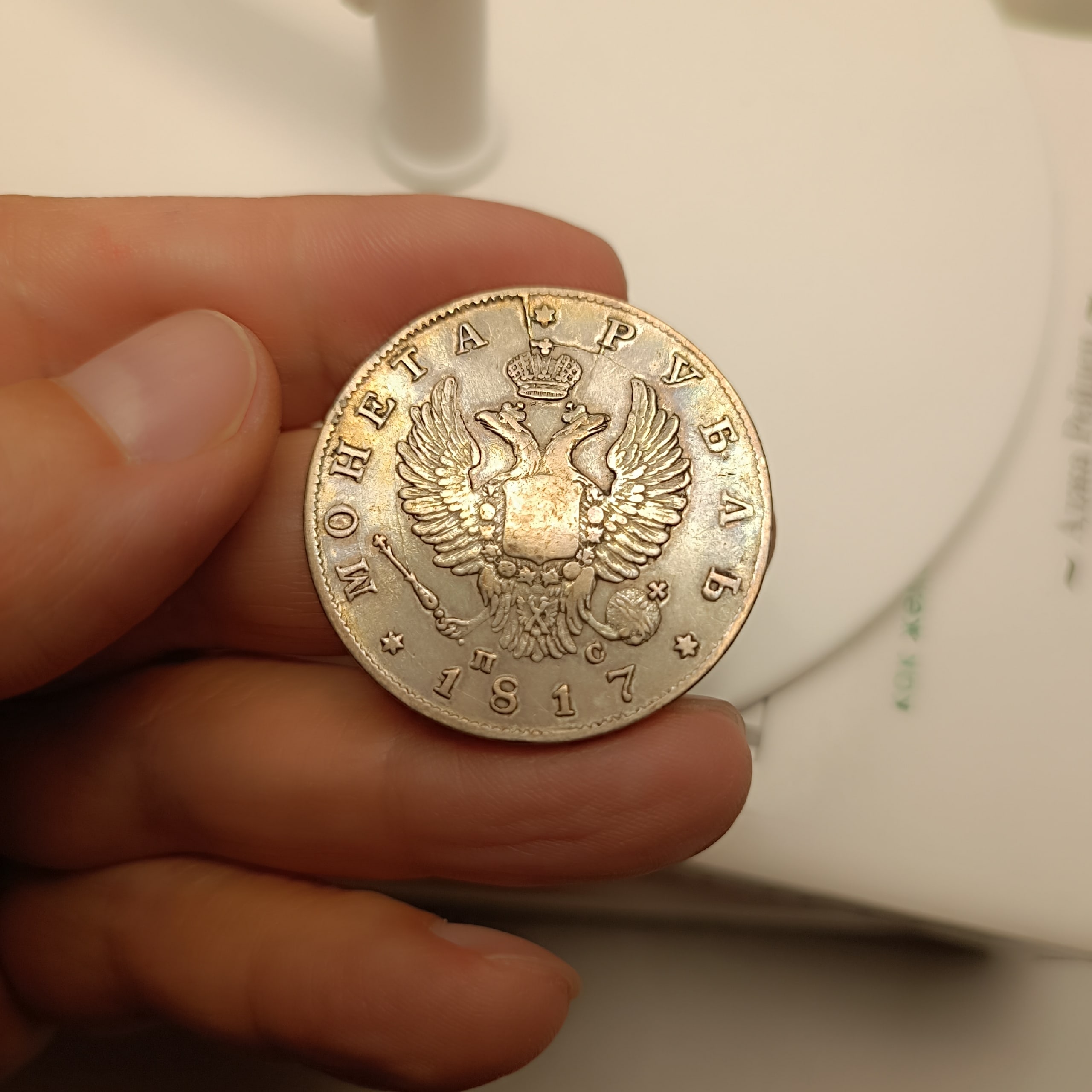Серебряный рубль 1817 года, отчеканенный на Санкт-Петербургском монетном дворе (обозначение «СПБ») при минцмейстере Павле Ступицыне («ПС»). Монета периода правления императора Александра I. Большинство экспертов в обсуждении признают её подлинной, указывая на характерный раскол штемпеля на реверсе как на сложно подделываемый признак оригинального чекана.