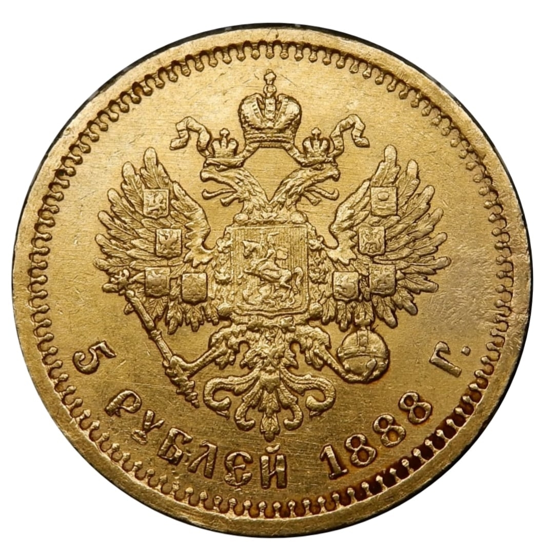 Золотая монета номиналом 5 рублей 1888 года, отчеканенная в период правления императора Александра III. Монета является подлинной, однако имеет характерные следы длительного ношения в качестве украшения (подвеса), что выражается в локальных потёртостях. Это оригинальный экземпляр, а не современная подделка.